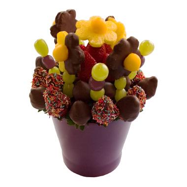 Csak extravagánsan a gyümölcsökkel is. Ezzel a csokorral biztosan feltűnést kelt akár családi, akár üzleti rendezvényen. A siker garantált. Tartalma eper, csokiba mártott eper, csokiba mártott - színes darás eper, félig és teljesen csokiba mártott ananászvirág, mangó, ananászvirág és szőlő.